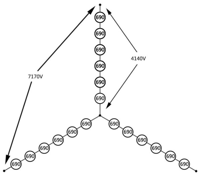 VFPS系列岸電電源系統(tǒng)采用功率單元串聯(lián)的形式,電壓疊加的原理類似于“電池組疊加”技術。當需要6.6kV輸出時,每相串聯(lián)6個功率單元,每個功率單元輸出的交流有效值為634V,相電壓3810V,線電壓6600V。每個單元最高可以輸出690V,系統(tǒng)最高可以輸出7170V。