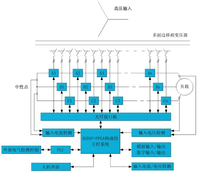 VFPS系列岸電電源系統(tǒng)由18個功率單元構成,每6個單元串聯(lián)構成一相,移相變壓器輸入側為36脈沖整流,輸出線電壓滿調(diào)制25電平,輸出側三相構成Y型接法,直接給船用系統(tǒng)供電。