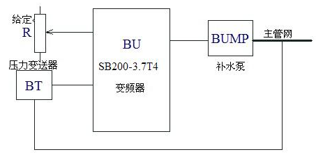 為更進(jìn)一步的節(jié)能,對(duì)換熱站實(shí)施了自動(dòng)化改造,循環(huán)泵和補(bǔ)水泵用變頻調(diào)節(jié),整個(gè)城市供熱系統(tǒng)用計(jì)算機(jī)進(jìn)行監(jiān)控,實(shí)現(xiàn)了換熱站無(wú)人值守。通過(guò)循環(huán)泵使熱水在供熱系統(tǒng)中運(yùn)行,管道、閥門(mén)的泄漏引起循環(huán)水的水壓降低,如不及時(shí)補(bǔ)水,會(huì)造成供熱系統(tǒng)運(yùn)行不正常。補(bǔ)水泵的變頻泵補(bǔ)水方式比較簡(jiǎn)單,采用恒壓供水方式,設(shè)定壓力為4kg。本例選用一臺(tái)SB200-3.7T4變頻器,選用森納斯DG130W-BZ-A 1MPa壓力變送器,變頻調(diào)速補(bǔ)水系統(tǒng)如圖所示:
