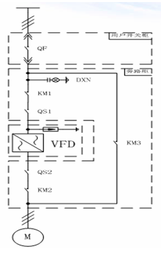 合KM3、分KM1、KM2、為工頻模式。電機(jī)可由QF直接啟停并進(jìn)行保護(hù),變頻器可完全和電網(wǎng)脫離。