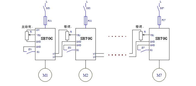 本例中,變頻器的輸出端子y1、y2輸出4~20mA信號,該信號作為下級速度信號,電位器可作微調(diào)。調(diào)整某一級,這級之后的速度也跟著改變,這樣,不因?yàn)檎{(diào)整而使后面的速比發(fā)生變化引起新的不同步。