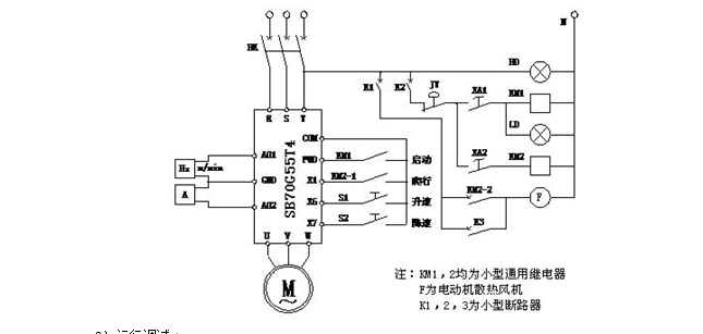 將其中的一臺(tái)直流電機(jī)改為二臺(tái)交流電機(jī)傳動(dòng),對(duì)普通鼠籠式電動(dòng)機(jī)進(jìn)行速度調(diào)節(jié)控制,根據(jù)變頻器輸出端口重新配置現(xiàn)場(chǎng)操作臺(tái)速度及電流顯示,利用原有控纜進(jìn)行分離連接控制。根據(jù)實(shí)際負(fù)載情況的測(cè)算,擬配置一臺(tái)SB70G55T4變頻器,一臺(tái)Y-280M6/55kW電動(dòng)機(jī)。