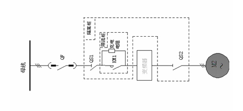 限流柜由高壓真空接觸器KM1與充電電阻R組成,限流電阻實(shí)現(xiàn)對變頻器電容軟充電,使上電過程中對電網(wǎng)無沖擊。