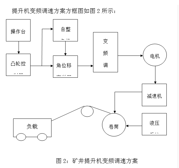 通過調研與論證,結合本公司礦井提升的現(xiàn)場實際情況,最終我公司技術中心做出決定,對提升機實施變頻調速改造,利用在機械行業(yè)中廣泛使用的自整角機來作為控制變頻器的速度給定。自整角機是通過角位移變送器輸出模擬量信號,操作工人搬動提升機操縱桿的角度,角位移變送器輸出相應大小的模擬量信號,由此控制變頻器運行頻率,進而控制提升的運行速度。這種操作方式還可用變頻器多段速控制,提升機只能在這幾種速度下運行。而角位移變送器輸出的是連續(xù)的角位移變送器輸出模擬量信號,理論上提升機可在任意速度下運行,操作起來會方便一些,且與原操作習慣相似,操作工人容易掌握。