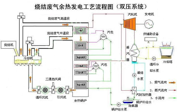 目前,國內(nèi)燒結(jié)廢氣余熱回收利用主要有三種方式:一是直接將廢煙氣經(jīng)過凈化后作為點(diǎn)火爐的助燃空氣或用于預(yù)熱混合料,以降低燃料消耗,這種方式較為簡單,但余熱利用量有限,一般不超過煙氣量的10%;二是將廢煙氣通過熱管裝置或余熱鍋爐產(chǎn)生蒸汽,并入全廠蒸汽管網(wǎng),替代部分燃煤鍋爐;三是將余熱鍋爐產(chǎn)生蒸汽用于驅(qū)動汽輪機(jī)組發(fā)電。
