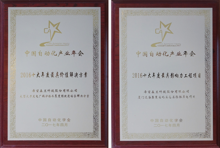 中國(guó)自動(dòng)化領(lǐng)域年度獎(jiǎng)項(xiàng)評(píng)選現(xiàn)場(chǎng),希望森蘭科技股份有限公司榮獲“2016中國(guó)自動(dòng)化領(lǐng)域十大年度企業(yè)”,公司“大型火力發(fā)電廠鍋爐給水泵變頻改造綜合解決方案”被評(píng)為“2016十大年度最具價(jià)值解決方案”,此外,“廈門遠(yuǎn)海集裝箱碼頭高壓船舶岸電項(xiàng)目”獲得“2016十大年度最具影響力工程項(xiàng)目”三項(xiàng)重要大獎(jiǎng)。