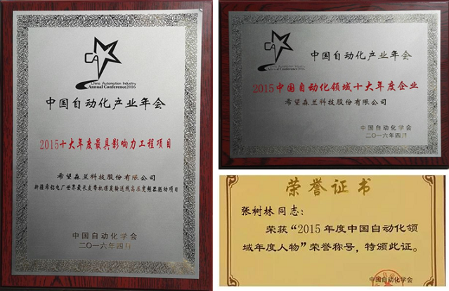 在2015中國自動(dòng)化領(lǐng)域年度獎(jiǎng)項(xiàng)評選現(xiàn)場,希望森蘭科技股份有限公司獲得“2015中國自動(dòng)化領(lǐng)域十大年度企業(yè)”,公司副總經(jīng)理張樹林先生榮獲“2015中國自動(dòng)化領(lǐng)域年度人物”,此外,希望森蘭的“新疆希鋁電廠世界最長皮帶機(jī)煤炭輸送線高壓變頻器驅(qū)動(dòng)項(xiàng)目”獲得“2015中國自動(dòng)化領(lǐng)域十大年度最具影響力工程項(xiàng)目” 三項(xiàng)重要大獎(jiǎng)。