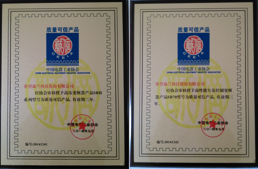 森蘭SBH系列高壓變頻器、SB70高性能矢量控制變頻器榮獲中國電器工業(yè)協(xié)會“質(zhì)量可信產(chǎn)品”獎