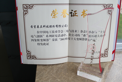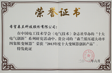 2013年6月22-23日“2013 第八屆中國電工裝備創(chuàng)新與發(fā)展論壇——電機系統(tǒng)節(jié)能技術與能效管理”暨“十大電氣創(chuàng)新企業(yè)及產(chǎn)品”系列評選活動在北京隆重舉行,森蘭低壓大功率四象限變頻器榮獲“2013年十大變頻器創(chuàng)新產(chǎn)品”稱號。