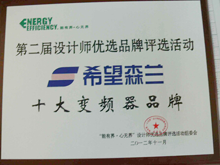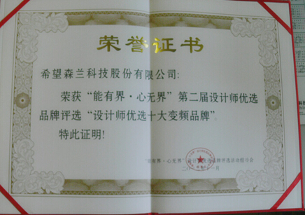 2012年11月30日,在北京舉行的第二屆設(shè)計師優(yōu)選品牌評選活動上,森蘭變頻器憑借過硬的產(chǎn)品質(zhì)量和良好的市場口碑,榮獲““設(shè)計師優(yōu)選十大變頻品牌”的稱號。